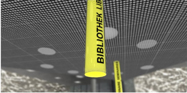 Die starke Farbe Gelb zieht die Aufmerksamkeit der über Kopf bündig in die Decke montierten Orientierungsmodule auf sich,